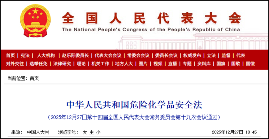 《中华人民共和国危险化学品安全法》表决通过,2026年5月1日起施行