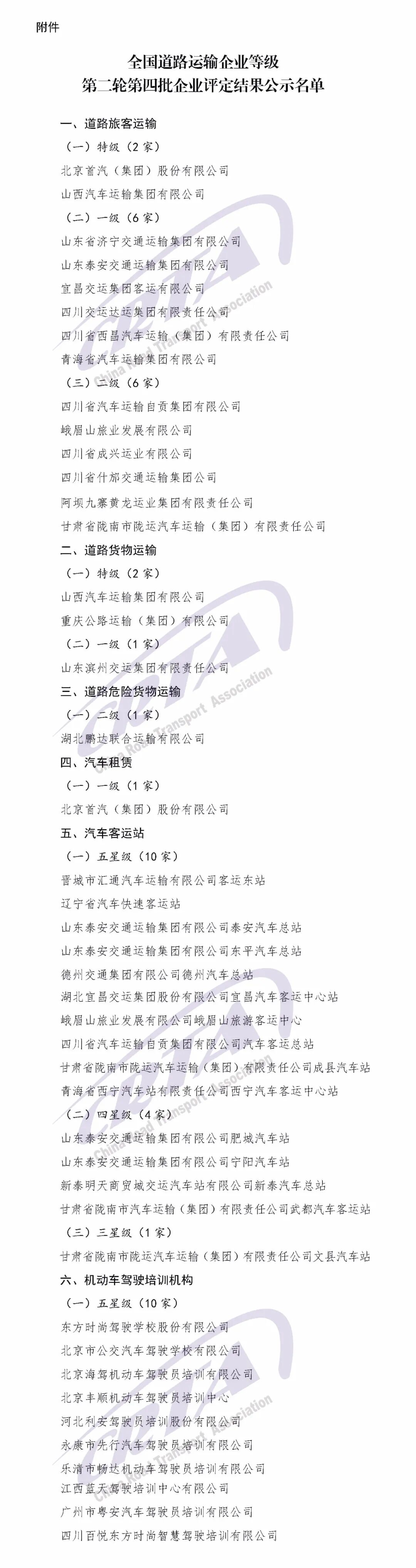 按照《道路运输企业等级评定实施办法》(第二版)有关规定,依据《道路旅客运输企业等级》《道路货物运输企业等级》《道路危险货物运输企业等级》《汽车租赁企业等级》《汽车客运站服务星级划分与评定》等5项交通运输行业标准,以及团体标准《机动车驾驶员培训机构服务星级划分与评定》,中国道路运输协会(简称:我会)于2024年10月18日组织专家评审委员会会议,对第二轮企业等级评定第四批申报特、一、二级道路运输企业,以及星级服务汽车站和机动车驾驶员培训机构的等级申报材料进行了评审。专家评审委员会将初步评定结果报送道路运输企业等级评定管理委员会,管理委员会经专题会议研究审议,决定:同意将初步通过评定的北京首汽(集团)股份有限公司等2家客运特级企业、山东省济宁交通运输集团有限公司等6家客运一级企业、四川省汽车运输自贡集团有限公司等6家客运二级企业;山西汽车运输集团有限公司等2家货运特级企业、山东滨州交运集团有限责任公司等1家货运一级企业;湖北鹏达联合运输有限公司等1家危险货物运输二级企业;北京首汽(集团)股份有限公司等1家汽车租赁一级企业;晋城市汇通汽车运输有限公司客运东站等10家五星级服务汽车客运站、山东泰安交通运输集团有限公司肥城汽车站等4家四星级服务汽车客运站、甘肃省陇南市陇运汽车运输(集团)有限责任公司文县汽车站等1家三星级服务汽车客运站;东方时尚驾驶学校股份有限公司等10家五星级服务机动车驾驶员培训机构名单进行公示(见附件)。公示期为2024年10月22日至28日。任何单位和个人如对公示对象有异议,均可以书面形式向我会提交材料反映情况,逾期不予受理(邮寄材料以邮戳日期为准)。为便于核查工作,单位反映情况需加盖公章,个人反映情况需签署真实姓名,并提供联系地址、电话和邮政编码。我会联系方式:道路旅客运输、汽车租赁、汽车客运站,郝志虎010-58731835;道路货物运输,庞亚琦010-58731836;道路危险货物运输,韩芳010-58731827;机动车驾驶员培训机构,孙跃010-58731825;电子邮箱:djpd@crta.org.cn;邮寄地址:北京市海淀区知春路甲48号盈都大厦C座3单元15层。附件:全国道路运输企业等级第二轮第四批企业评定结果公示名单中国道路运输协会