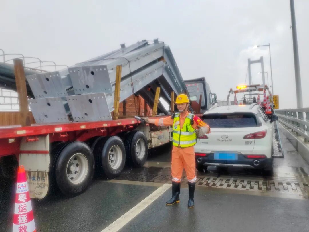豆大的雨点拍打在脸上,但丝毫不影响身穿反光衣的粤运拯救海鸥岛驻勤点党员队员钟伟明,笔挺地正站在桥上警惕地盯着来车方向,手持式爆闪灯随着他的手势不停上下挥舞,提醒着过往车辆此处正在作业。